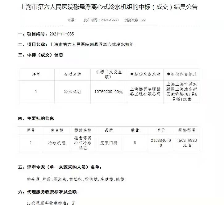上海市第六人民医院磁悬浮离心式冷水机组的中标